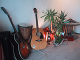 ギターにジャンべが持ち込まれています。サーフィンにバイク、音楽といったサイドカルチャーも